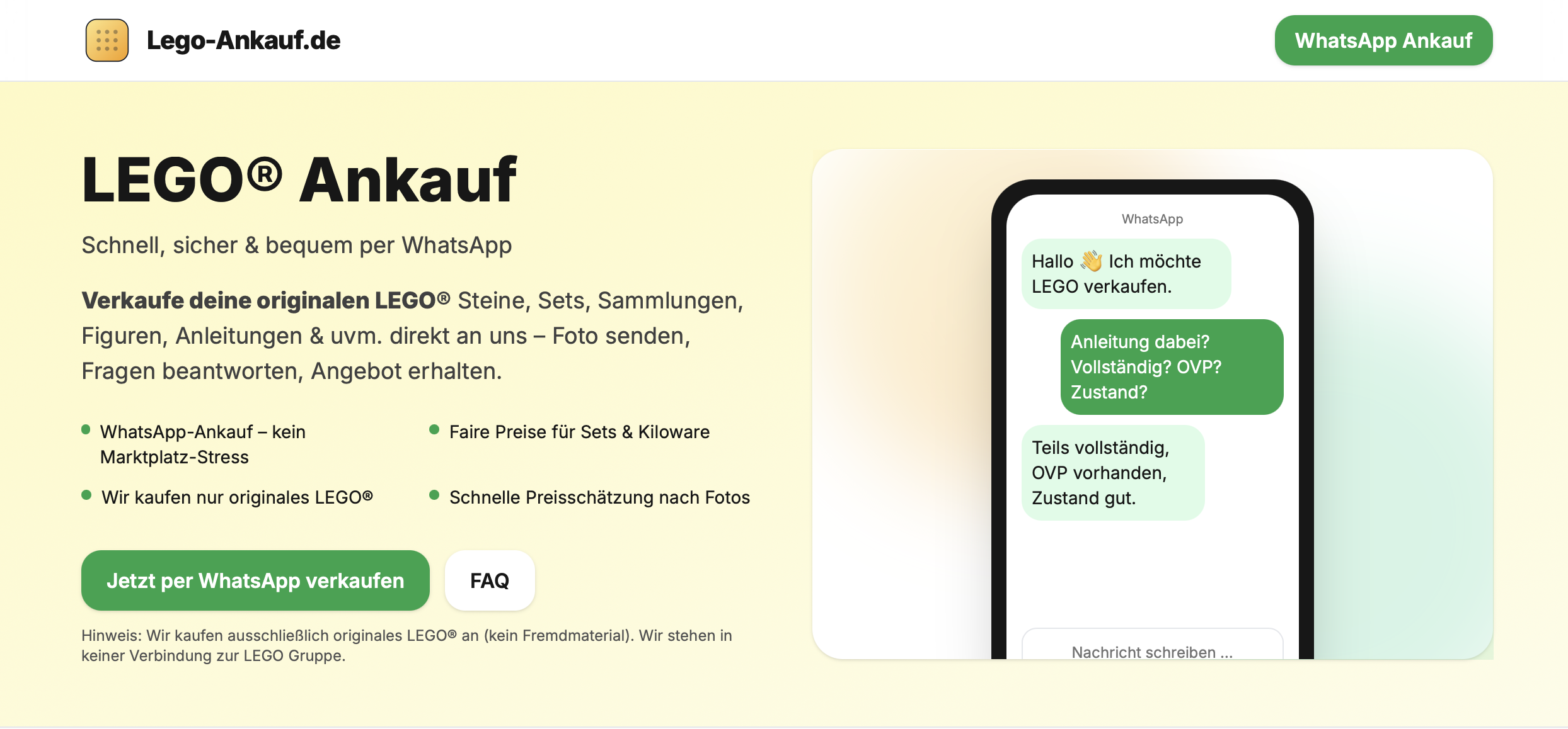 Verkauft wird eine Website mit der man Lego® Bausteine ankaufen kann. Perfekt für Händler / wiederverkäufer.