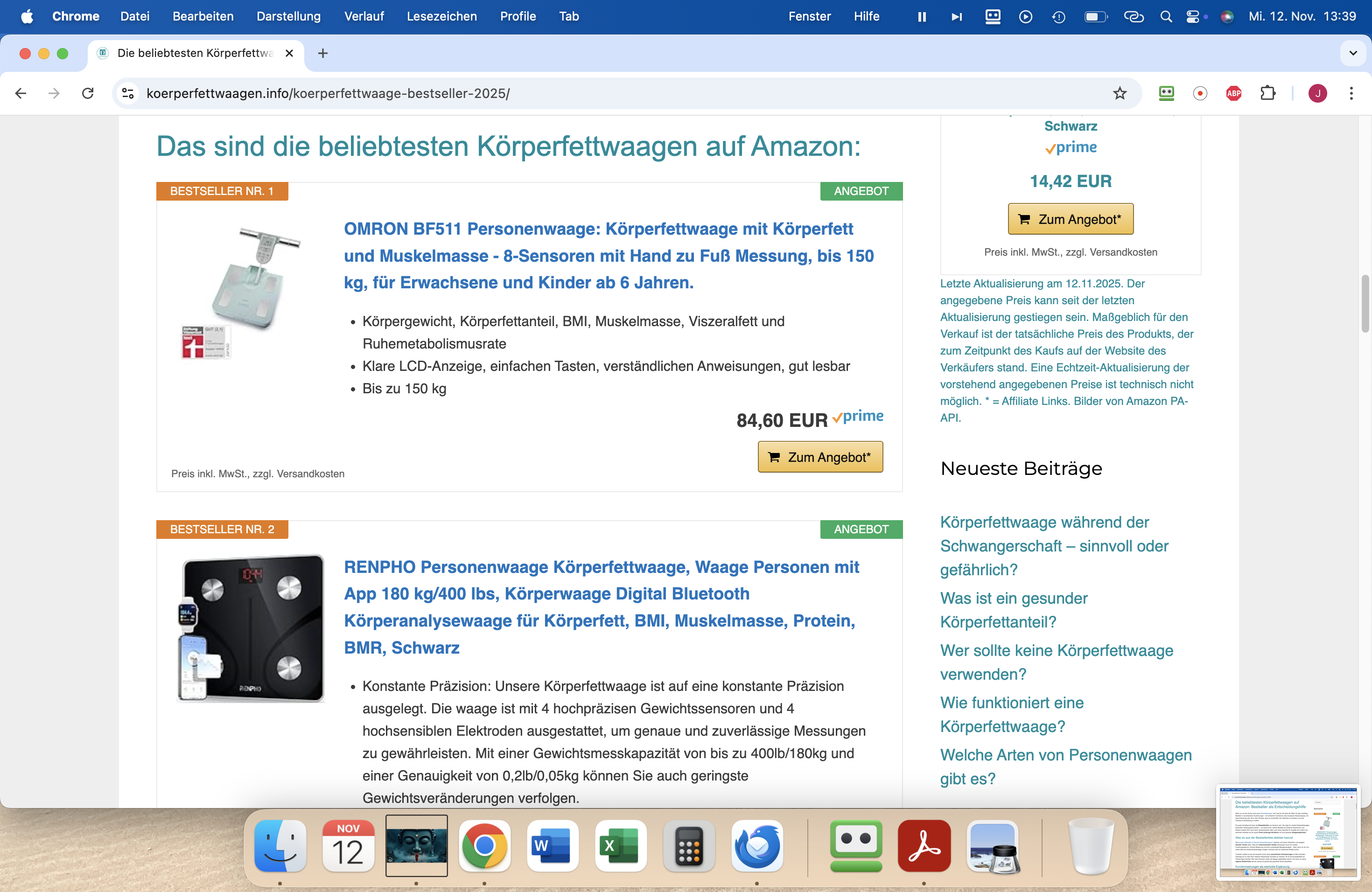 Wegen beruflicher Neuorientierung und Zeitmangel verkaufe ich mein Affiliate Projekt zum Thema Körperfettwaagen. Die Domain wurde 2020 von mir registriert. Die Website wurde mittels WordPress erstellt. Sie enthält sechs Ratgebertexte, eine Bestsellerseite, einen BMI- sowie einen Kalorienbedarfsrechner, die beide direkt auf der Website verwendet werden können. Neben einem Einleitungstext für Premiumprodukte werden drei Premiumprodukte ausführlich vorgestellt. Weiters gibt es einen Einleitungstext für Körperfettwaagen mit Handsensoren, wobei zwei Produkte gesondert mittels ausführlicher Beschreibung vorgestellt werden. Alle Texte auf der Website sind ansprechend formatiert und seo-optimiert.