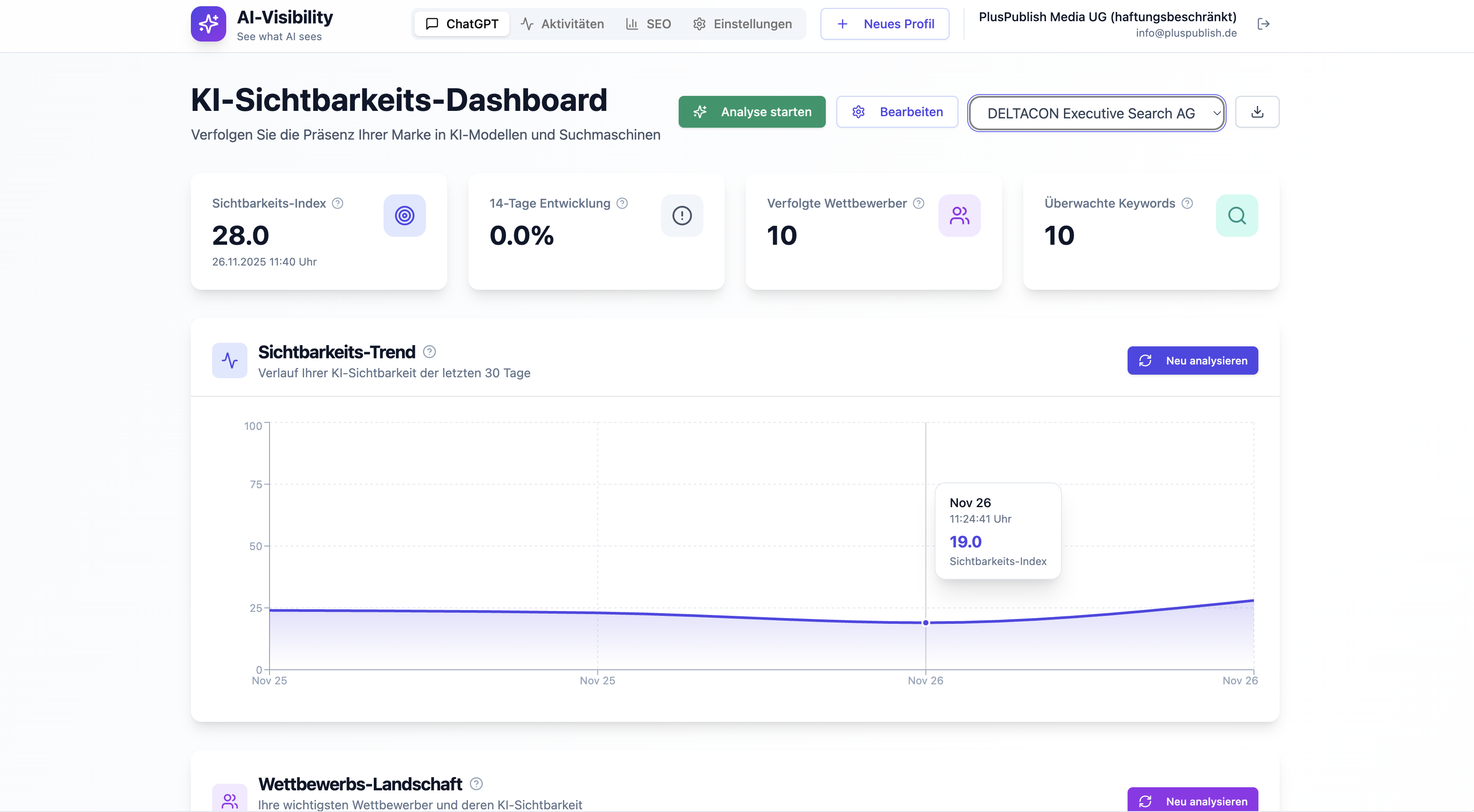 Die Software basiert auf der aktuellen React Version, ist responsive und vollständig Multi User sowie Multi Mandanten fähig. Mehrere Kunden oder Agenturen können parallel mit getrennten Daten arbeiten. Sämtliche KI Abfragen laufen automatisiert und ressourcensparend über Cronjobs. Die Anbindung der KI erfolgt über API Keys, die einfach in den Einstellungen hinterlegt werden.