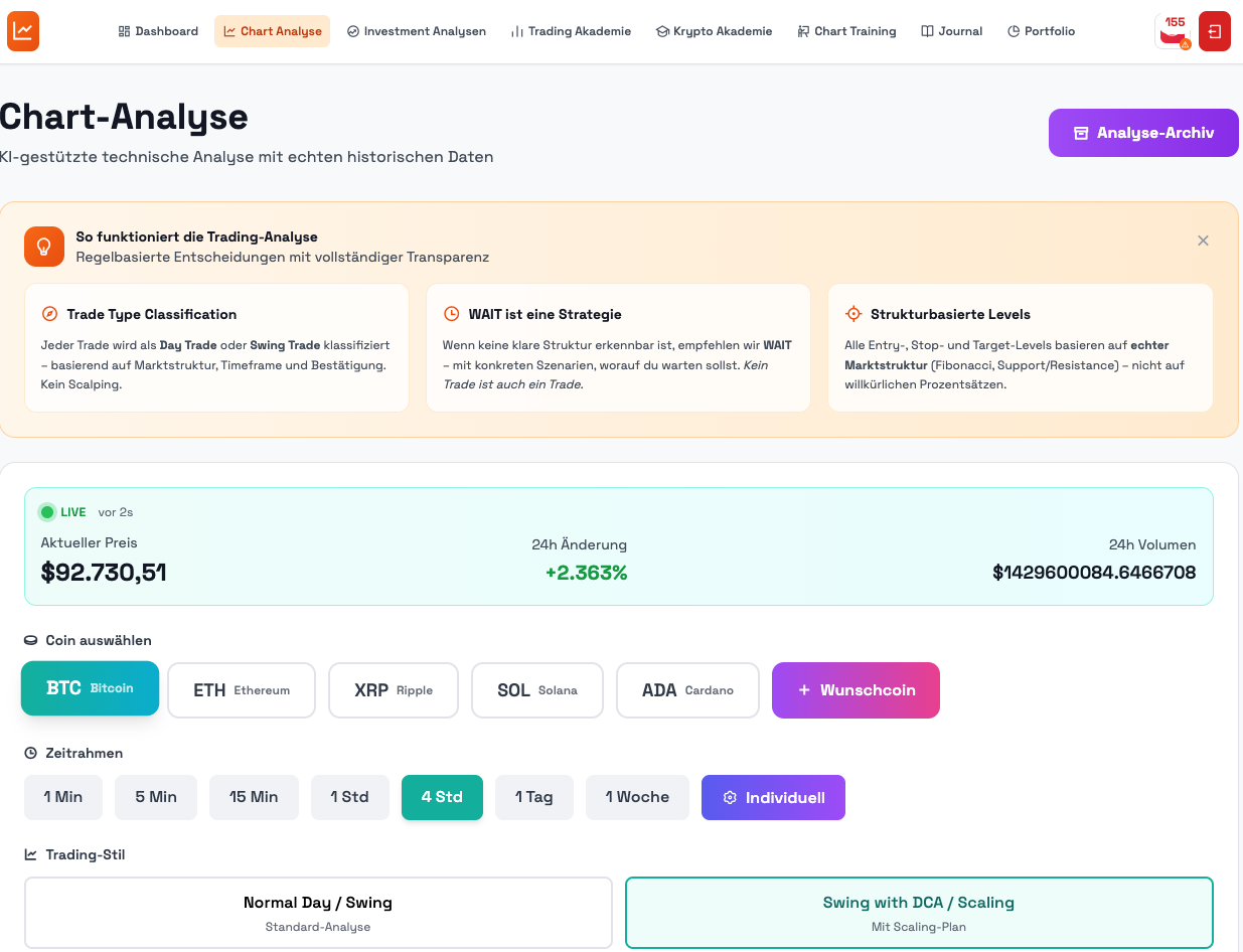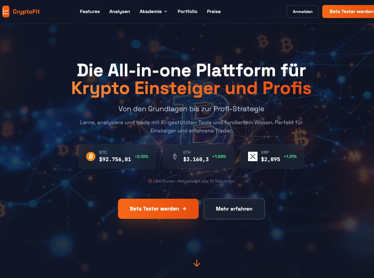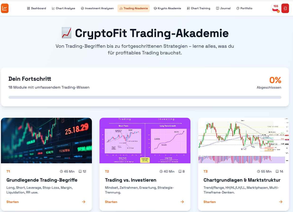 CryptoFit ist eine vollständig entwickelte, KI-gestützte Krypto-Plattform, die Ausbildung, Analyse und Trading-Praxis in einem modularen System vereint.